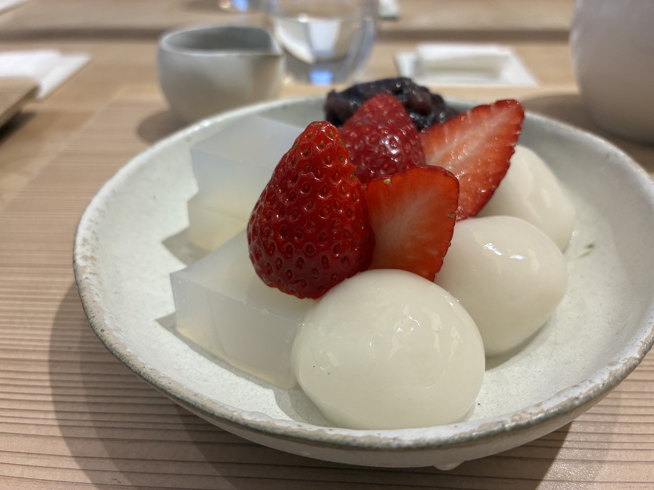 私のオーダーしたのは、季節限定「苺の白玉あんみつ」抹茶付き。