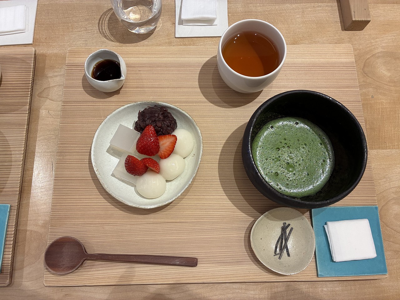私のオーダーしたのは、季節限定「苺の白玉あんみつ」抹茶付き。