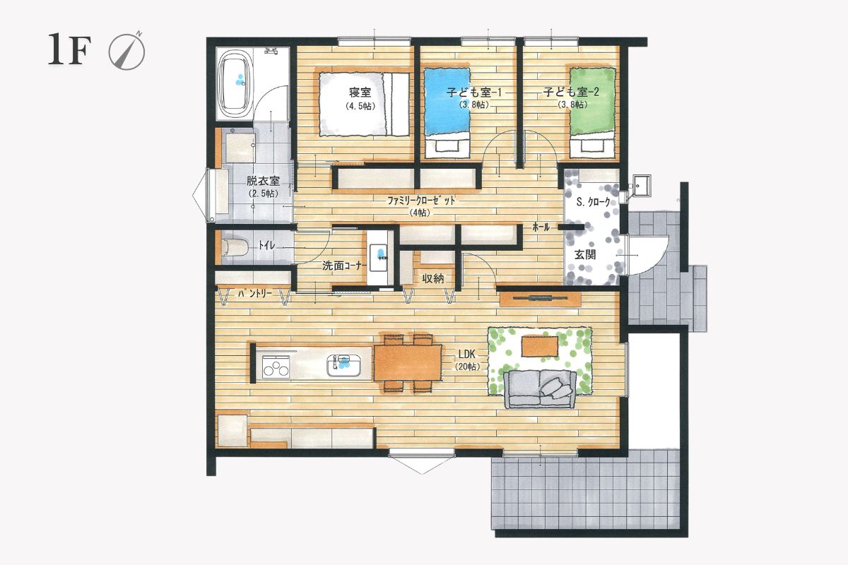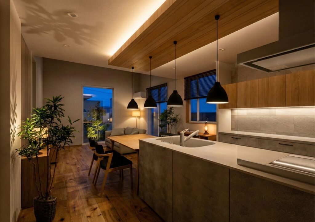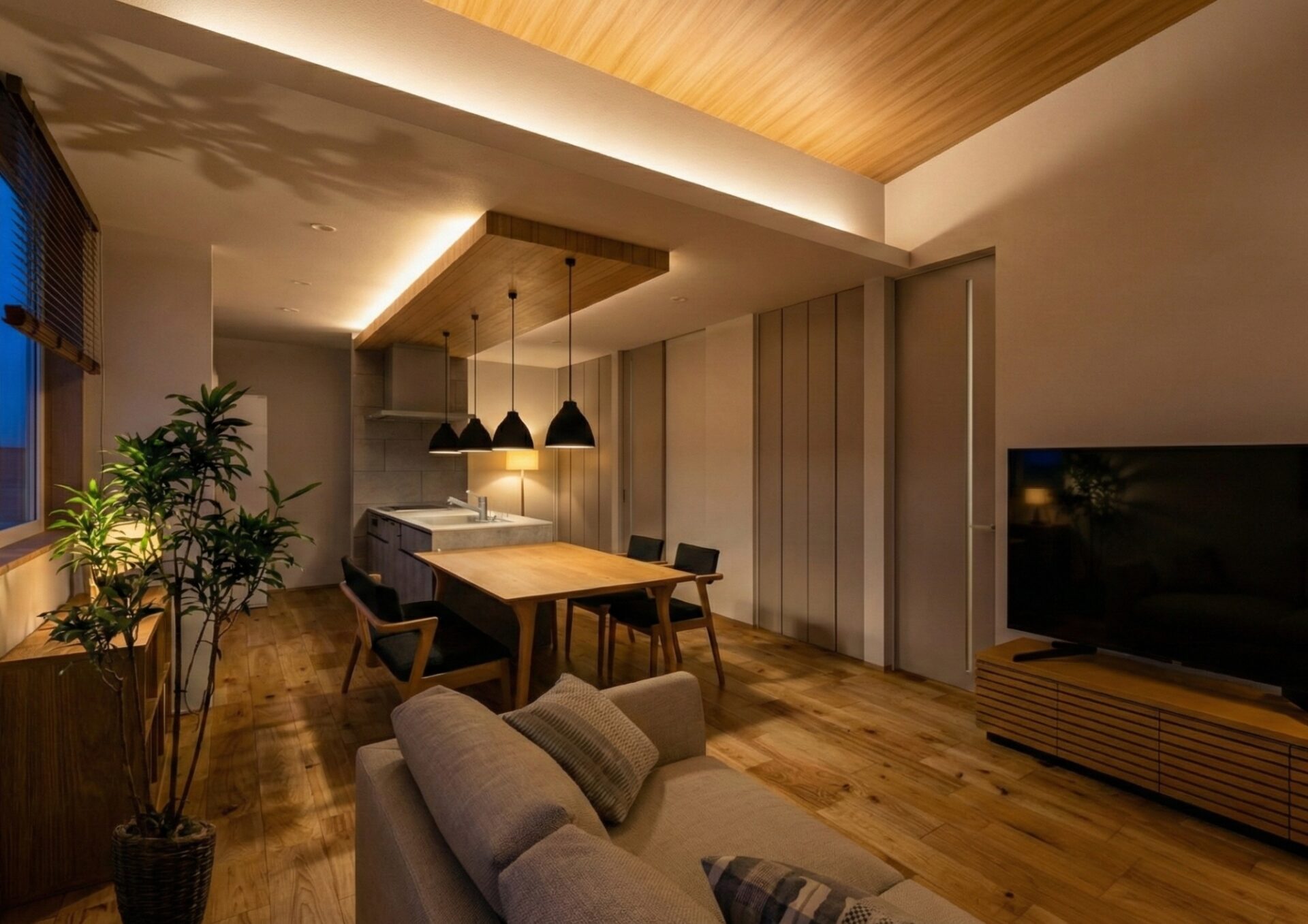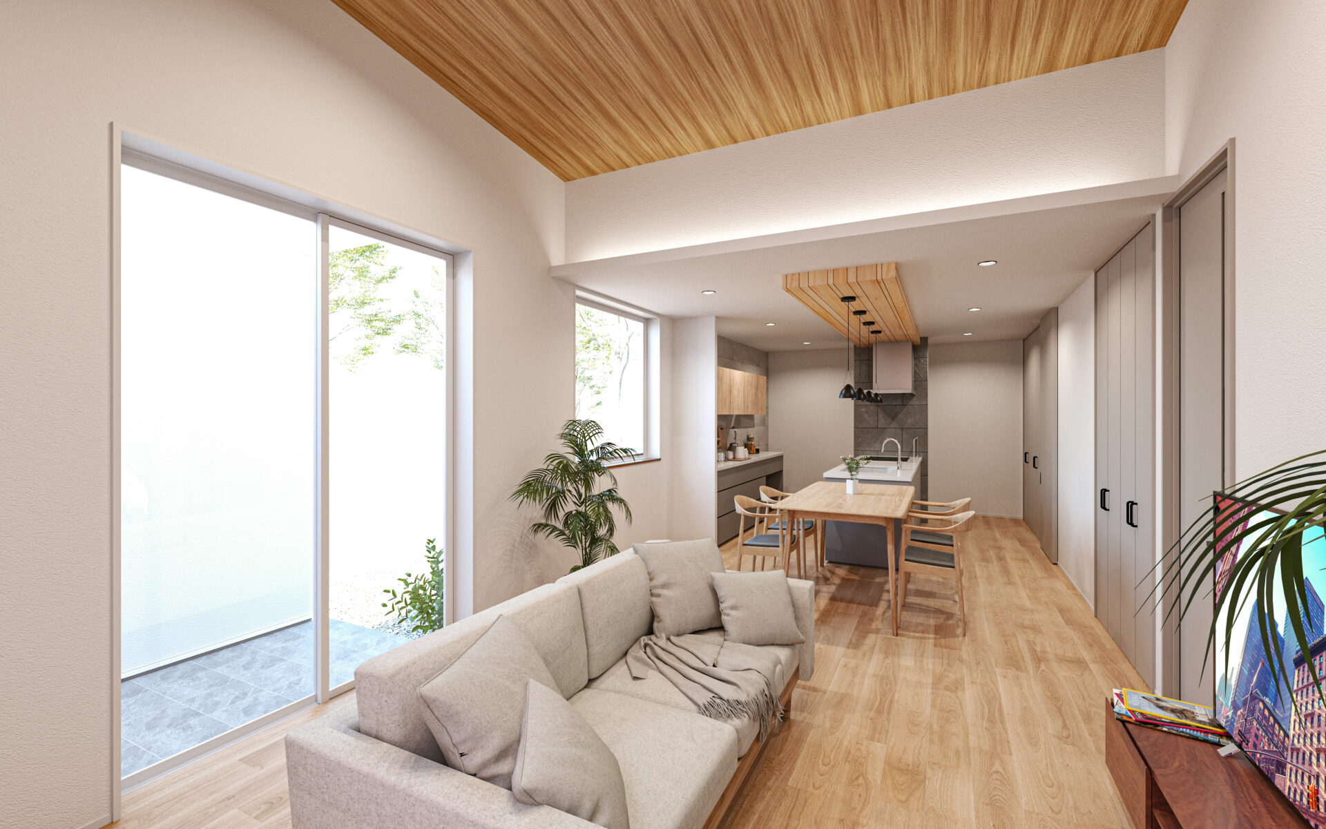 20帖のLDKと勾配天井がもたらす開放感。視線を気にせずくつろげるインナーテラスは、家族が自然と集い、のびのび寛げるストレスフリーな日常を叶えます。