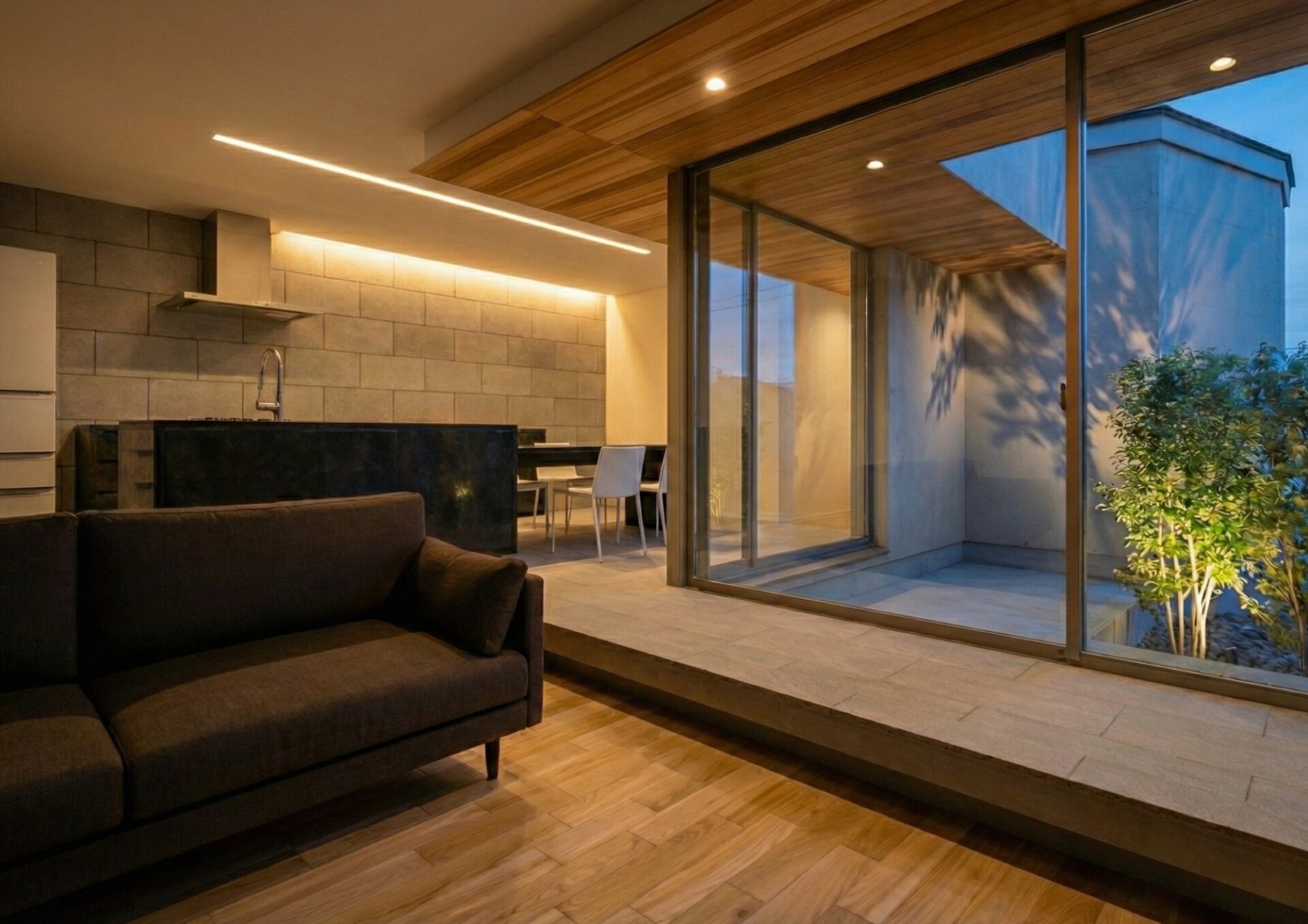 朝は澄んだ空気の中でコーヒーを、夜は柔らかな灯りを眺めながらグラスを傾ける。外の喧騒を遮断し、内と外をゆるやかにつなぐプライベートな空間が、日常に深い安らぎをもたらします。