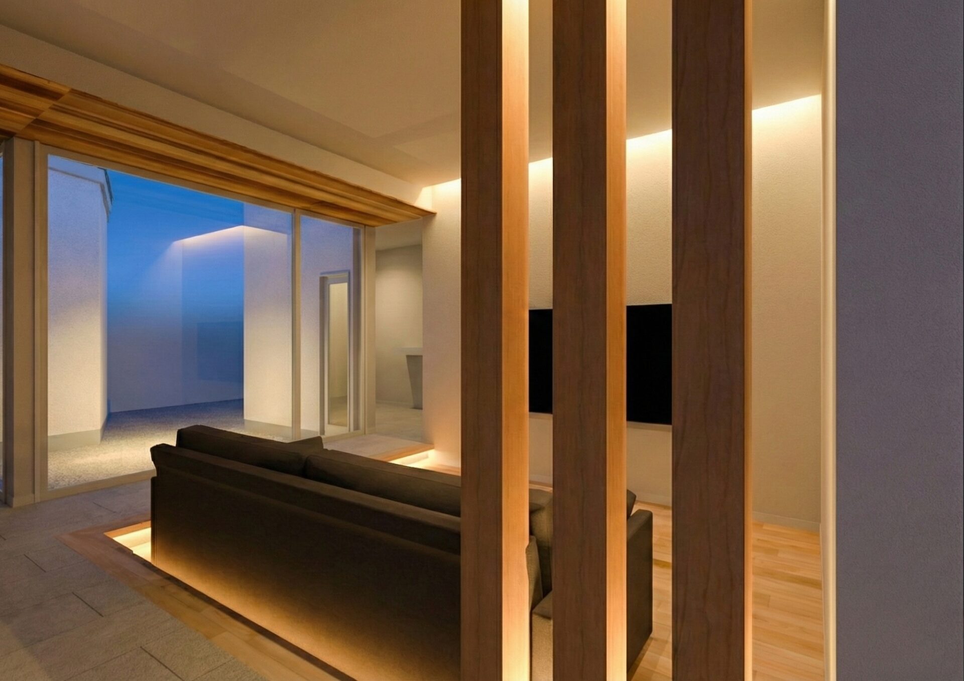 一段下げた床が、空間に包み込まれるような心地よさを演出。ソファに深く腰掛けてテラスを眺めながら、お酒や映画をゆっくりと嗜む。大人だけの静かで贅沢な夜の時間が流れる特等席です。