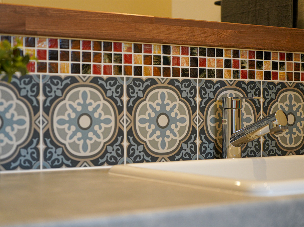 洗面台を彩るのは、お施主様が海外旅行で出会った風景をイメージして選んだこだわりのタイル。