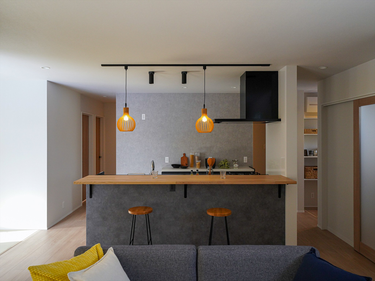 質感豊かなモルタル調の腰壁と、温かみのある幅広の木製カウンターが融合した、