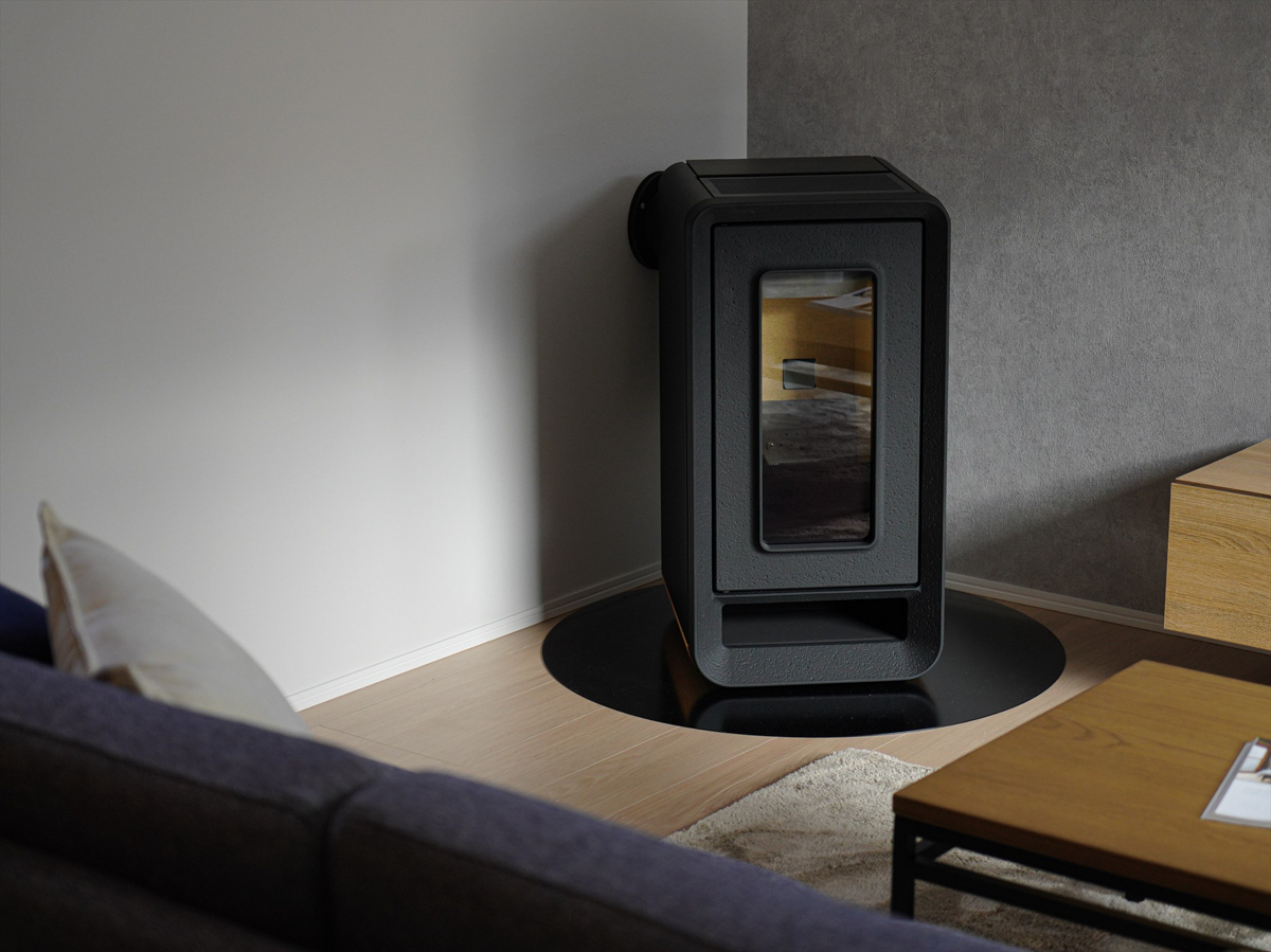 シックなグレーのアクセントウォールに映える、モダンなデザインのペレットストーブ 。