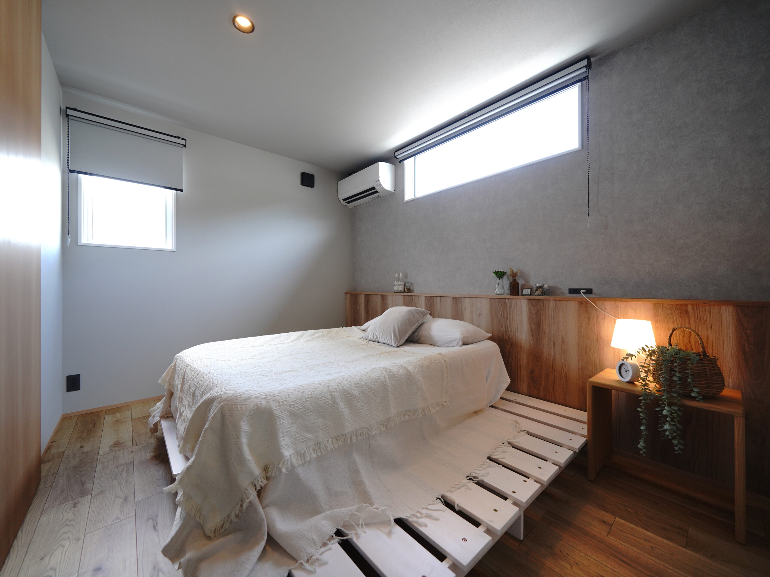 落ち着きのあるグレーの壁と、温かみのある木の造作ヘッドボード。