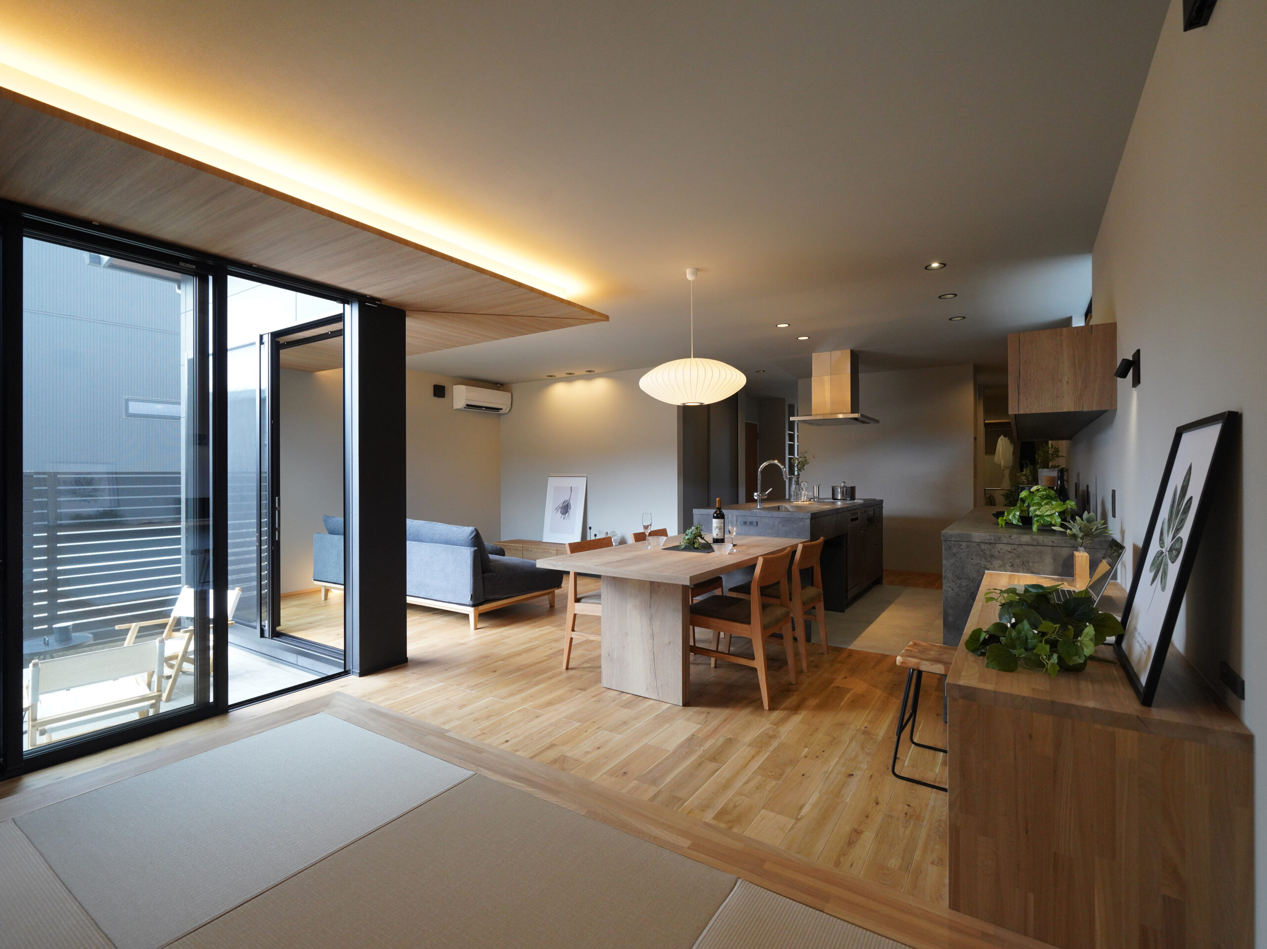 グレーのキッチンと木の温かみを組み合わせ、間接照明で上品に仕上げた大人な空間。