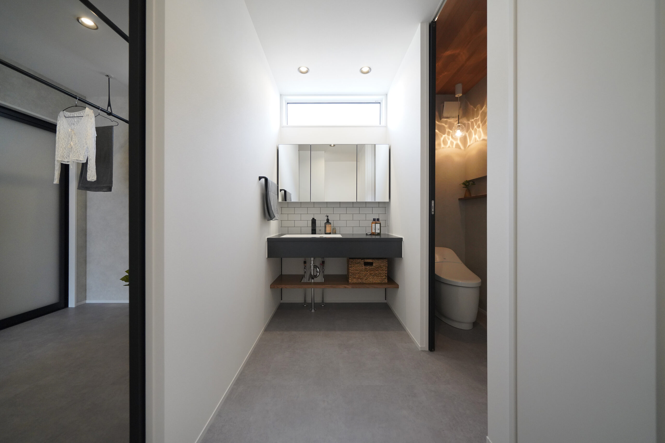 落ち着いたグレーのトーンと木目の温かみが調和する、洗面スペース。