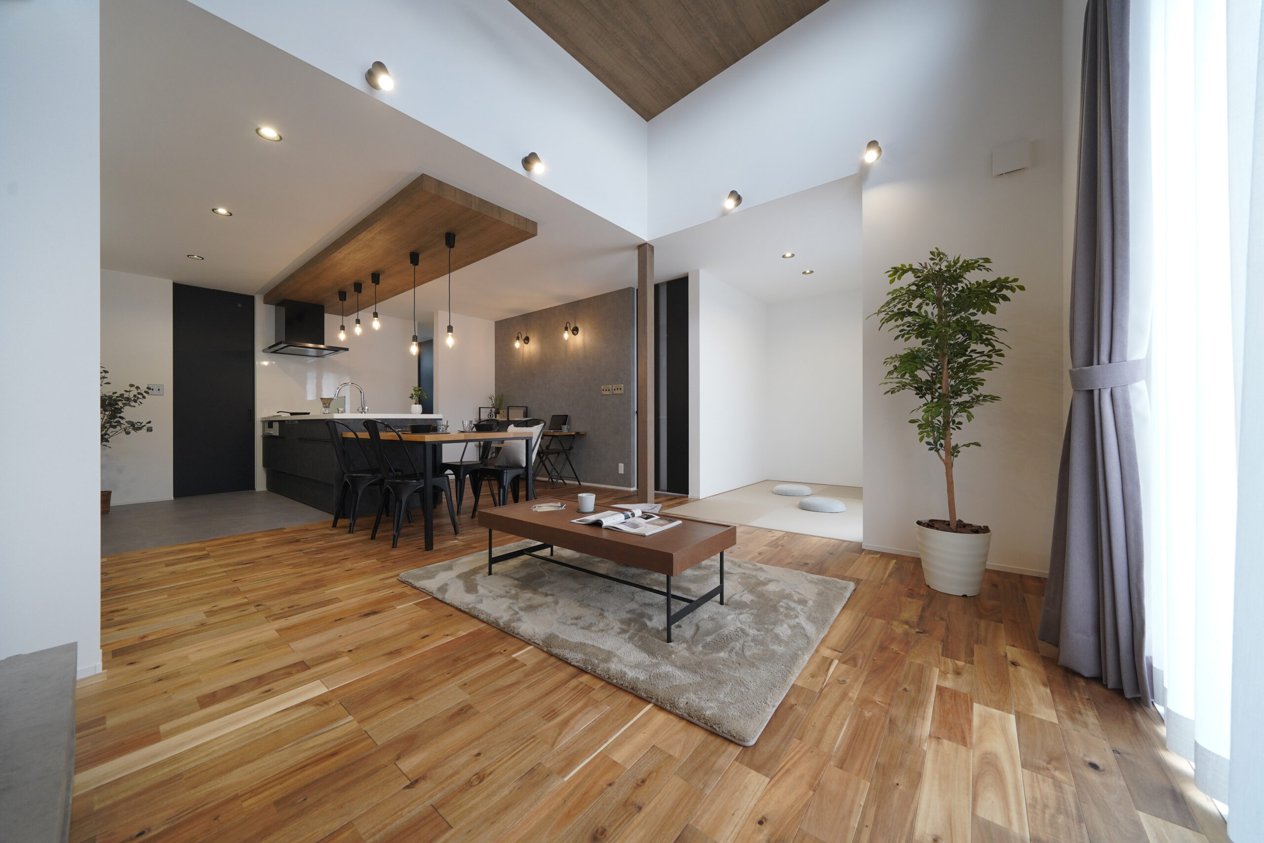 平屋ならではの勾配天井と、キッチンの下がり天井が空間に心地よいリズムをプラス。
