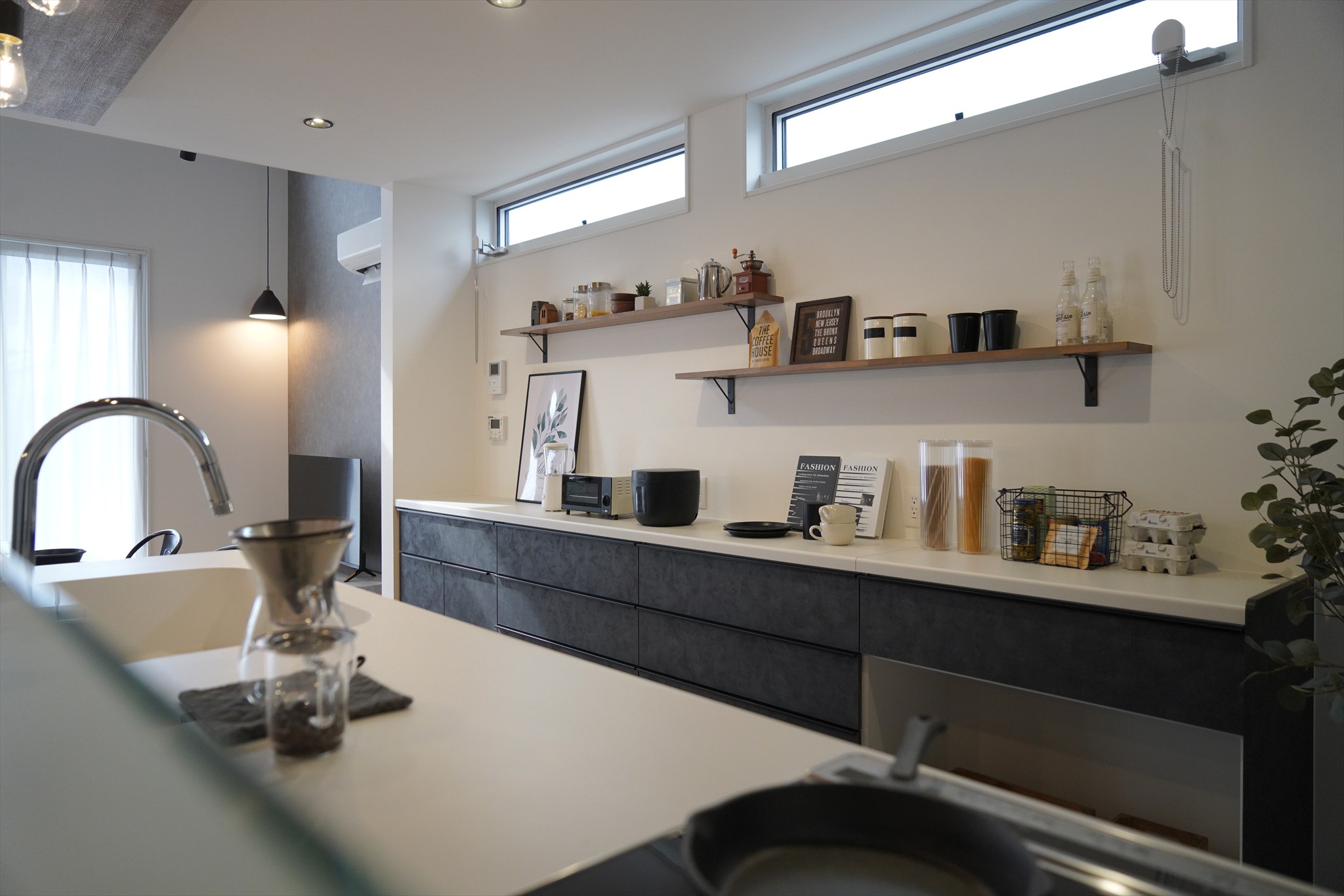 グレー×ホワイト×木のバランスが絶妙な、 見せる飾り棚が映えるキッチン。